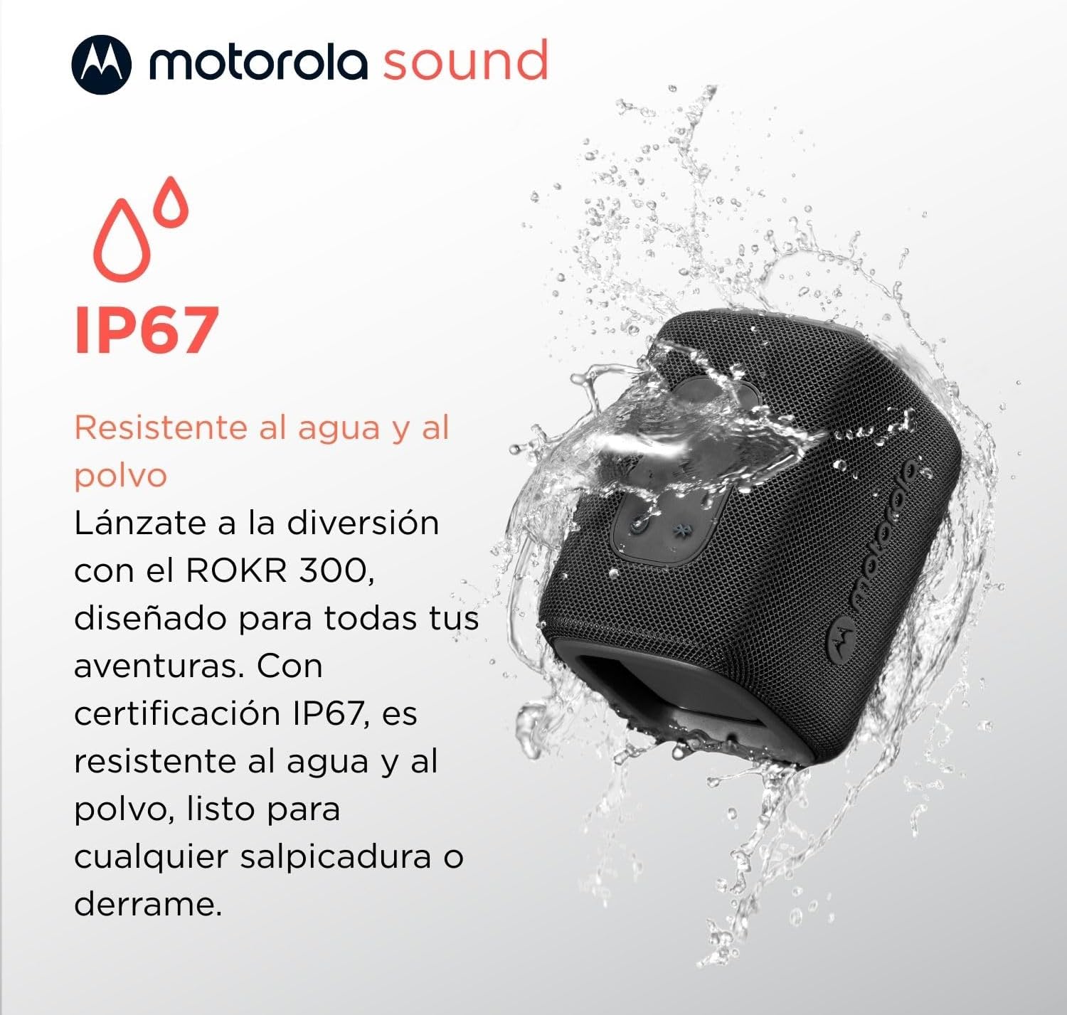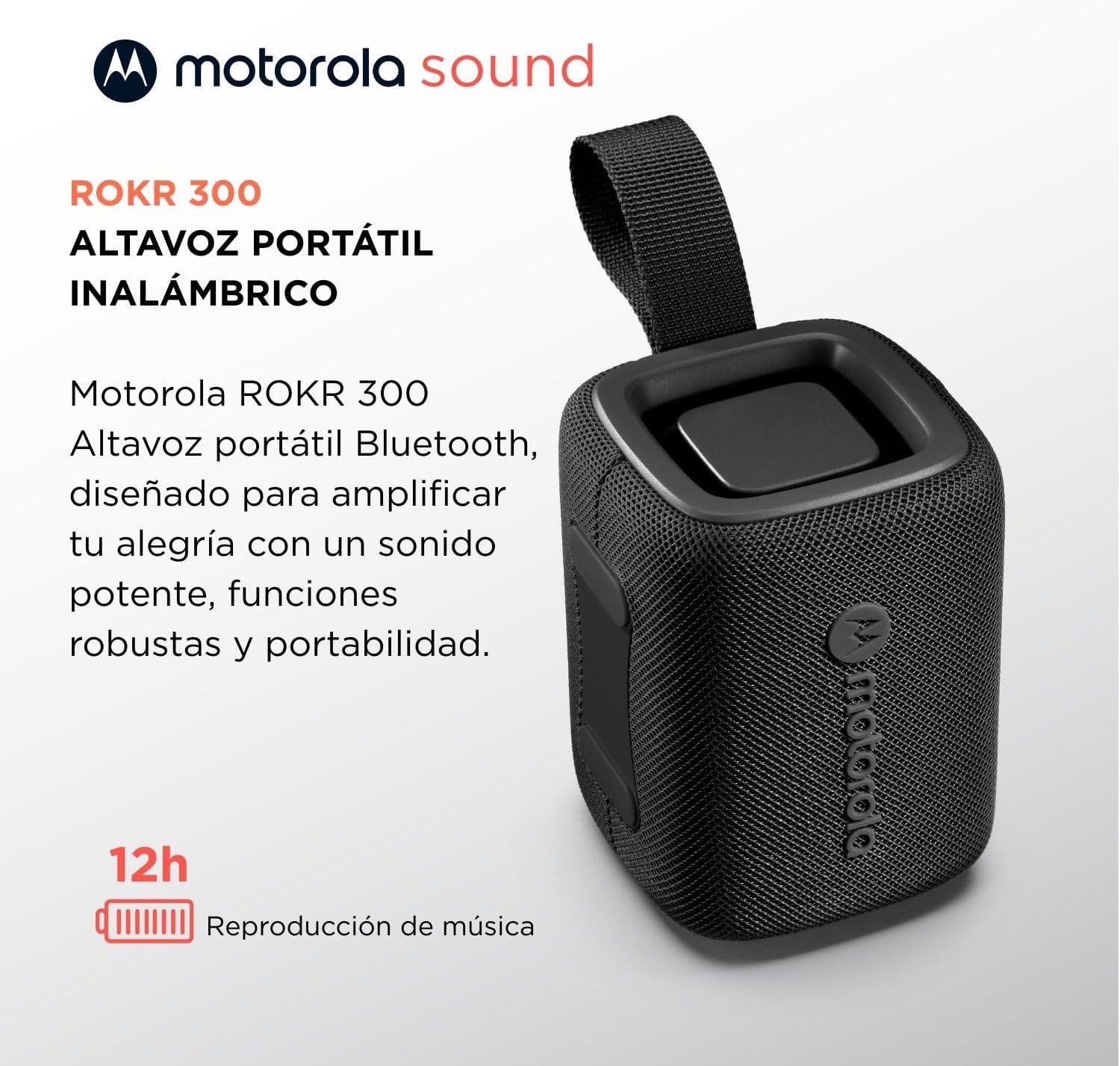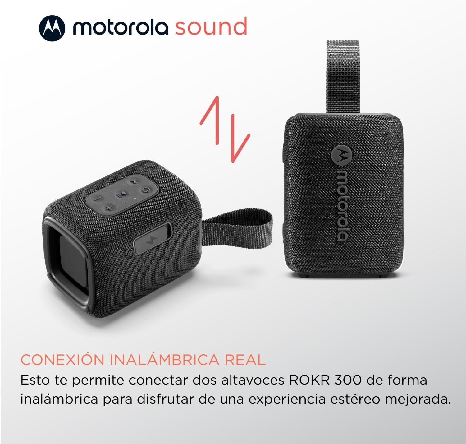 - Altavoz Bluetooth compacto y portátil: El Motorola ROKR 300 es un altavoz inalámbrico portátil que ofrece un sonido potente, bajos profundos y voces claras gracias a su altavoz de 7W y dos radiadores pasivos.