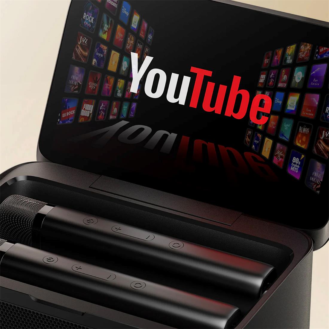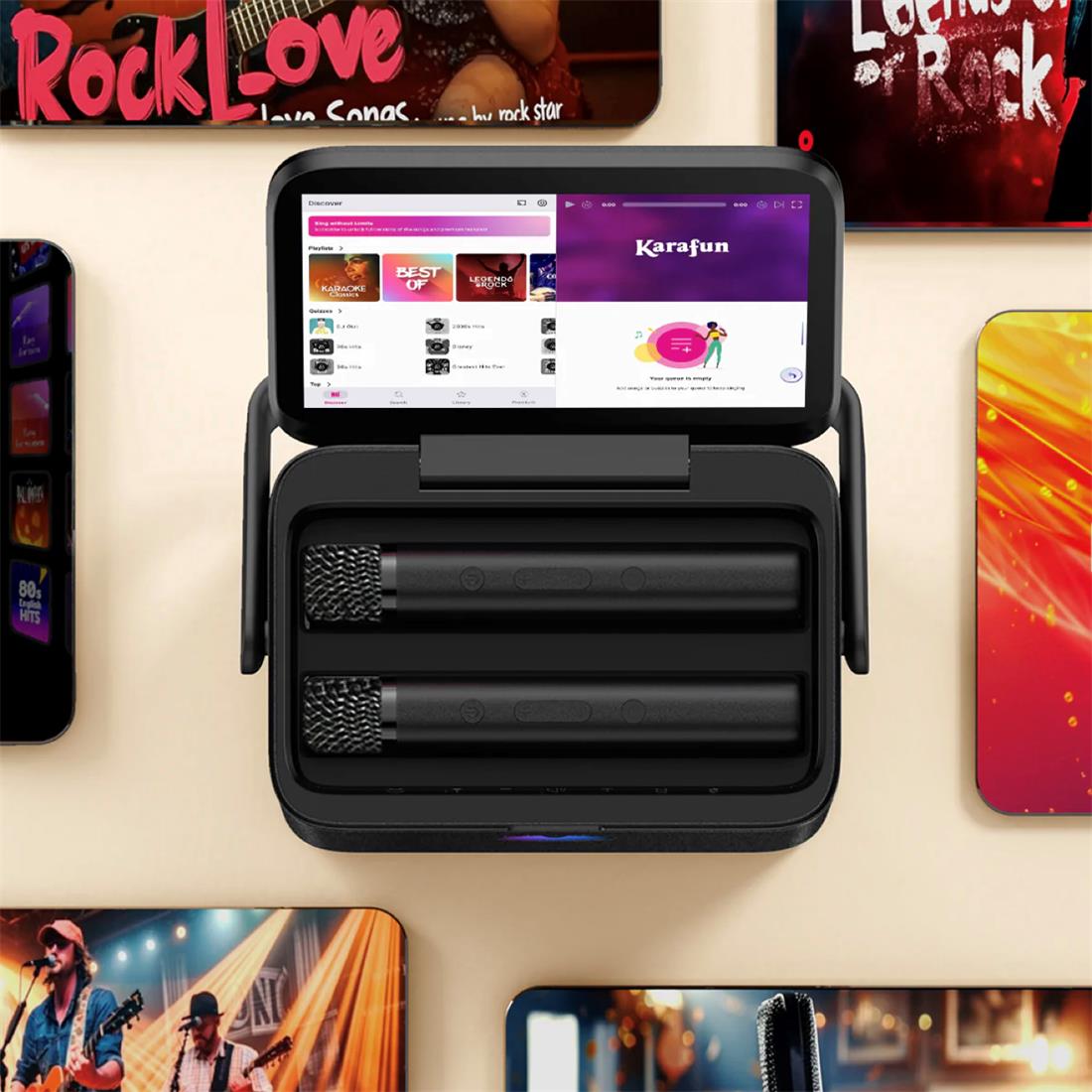 - Esta mini máquina de karaoke cuenta con una pantalla de letras, un mango integrado y powerbank, además de ser un potente altavoz Bluetooth de 80W.