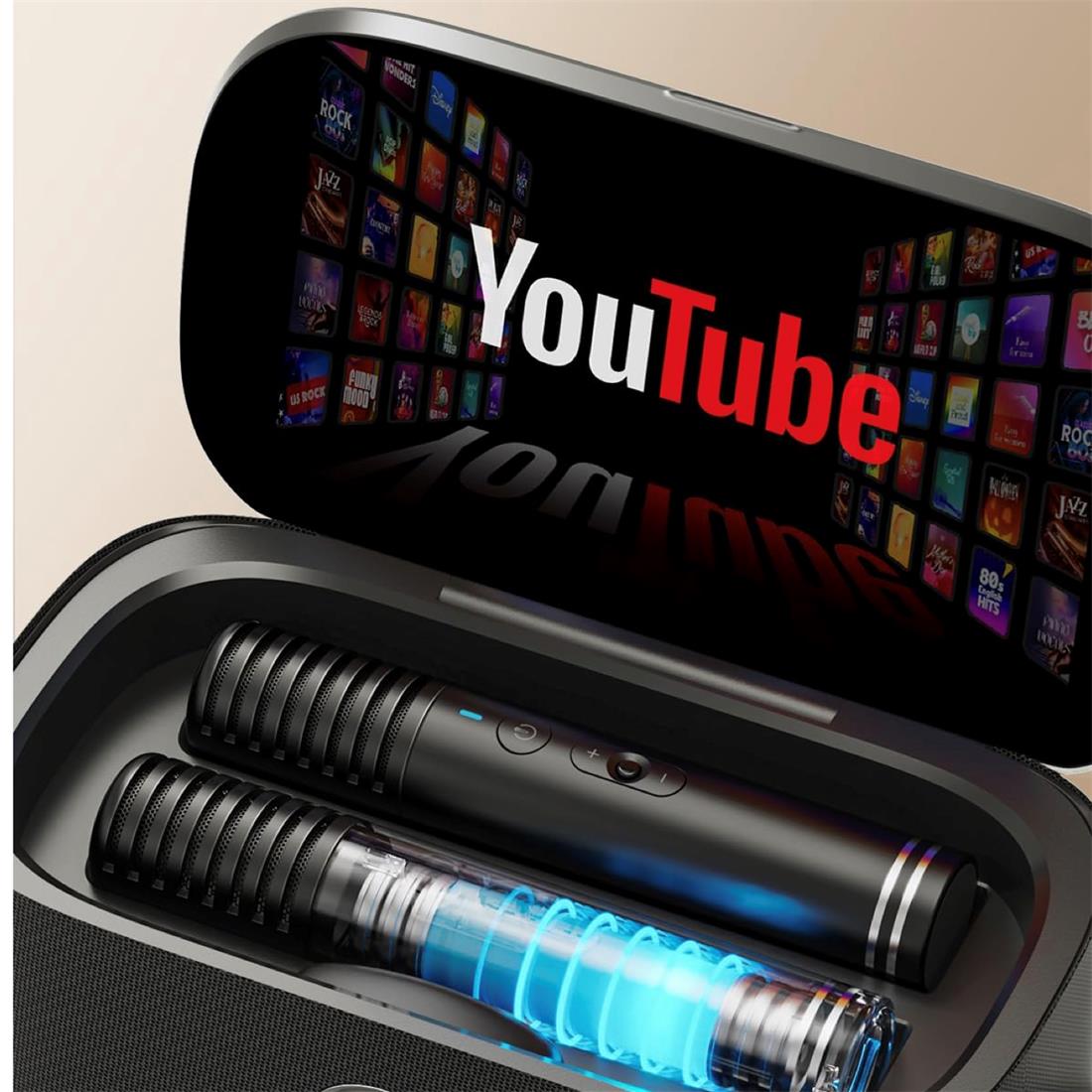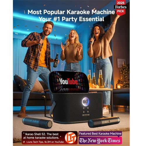 - KaraFun Prime – La máquina de karaoke perfecta para adultos y niños, equipada con una pantalla que muestra las letras, 2 micrófonos inalámbricos (autocarga), un mango integrado y una batería externa. Con un potente altavoz Bluetooth de 140 W, la Ikarao Shell S2 es la solución ideal para disfrutar de karaoke en cualquier lugar, ya sea en casa, en reuniones, o al aire libre.