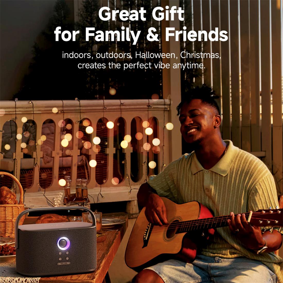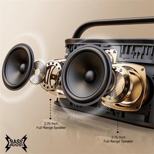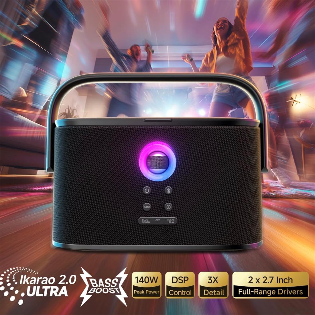 - El altavoz de karaoke cuenta con un sistema de doble rango completo de 2.7 pulgadas alimentado por Ikarao Pro Sound 3.0, que ofrece una impresionante potencia máxima de 140 W. Gracias a sus chips DSP y tecnología de cruce inteligente, el sonido se mantiene equilibrado, con reducción de ruido y cancelación de eco, asegurando que cada nota suene tan clara como en una actuación en vivo. Además, cuenta con un botón de refuerzo de graves para una resonancia profunda que te hará vibrar.