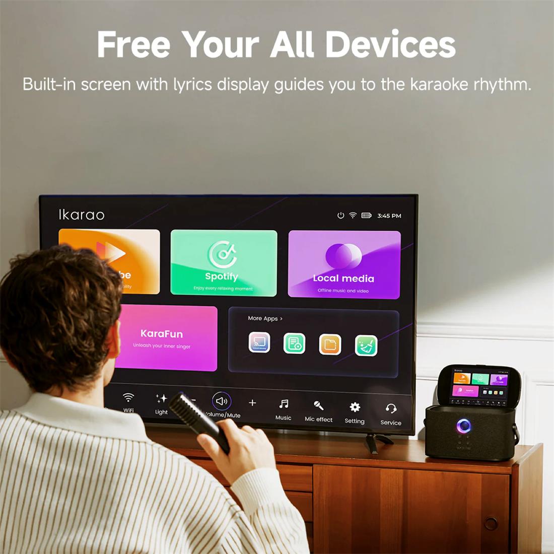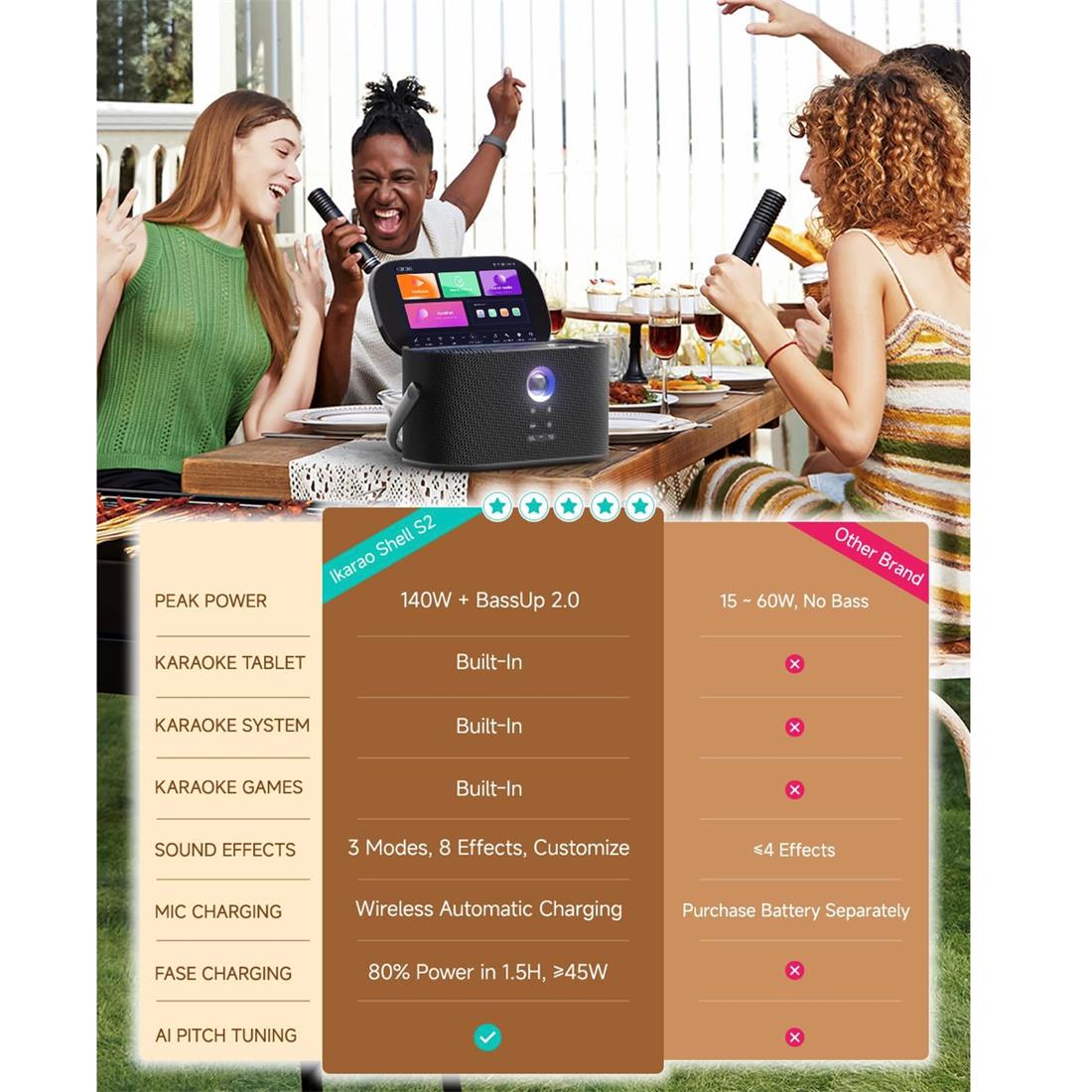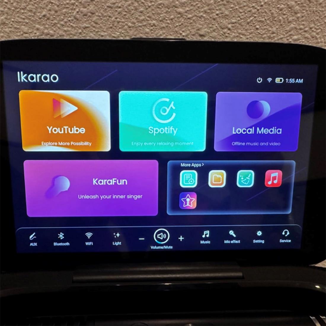 - Esta máquina de karaoke todo en uno está diseñada para ofrecer una experiencia completa. Con aplicaciones de karaoke integradas, podrás buscar y seleccionar fácilmente tus canciones favoritas. La Ikarao Shell S2 incluye: