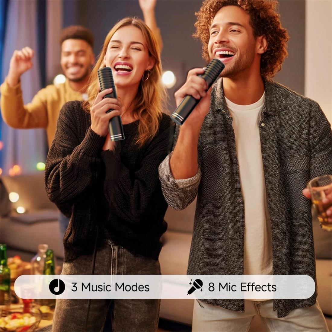 - La máquina de karaoke portátil incluye 2 micrófonos inalámbricos, 8 efectos de sonido y ajustes de ecualización. Cada micrófono se ajusta de forma independiente, eliminando interferencias. La pastilla supercardioide garantiza un sonido claro y natural, convirtiéndote en la estrella del escenario. Las ranuras superiores para altavoces no solo permiten el almacenamiento, sino también la carga de los micrófonos, por lo que no tendrás que preocuparte por perderlos o por la batería baja. Ideal para: