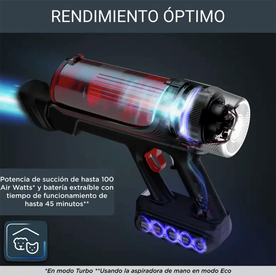 - Potente Succión: Con una capacidad de hasta 100 airwatts, esta aspiradora garantiza una potente succión constante que maximiza la eficiencia de limpieza a lo largo del tiempo.