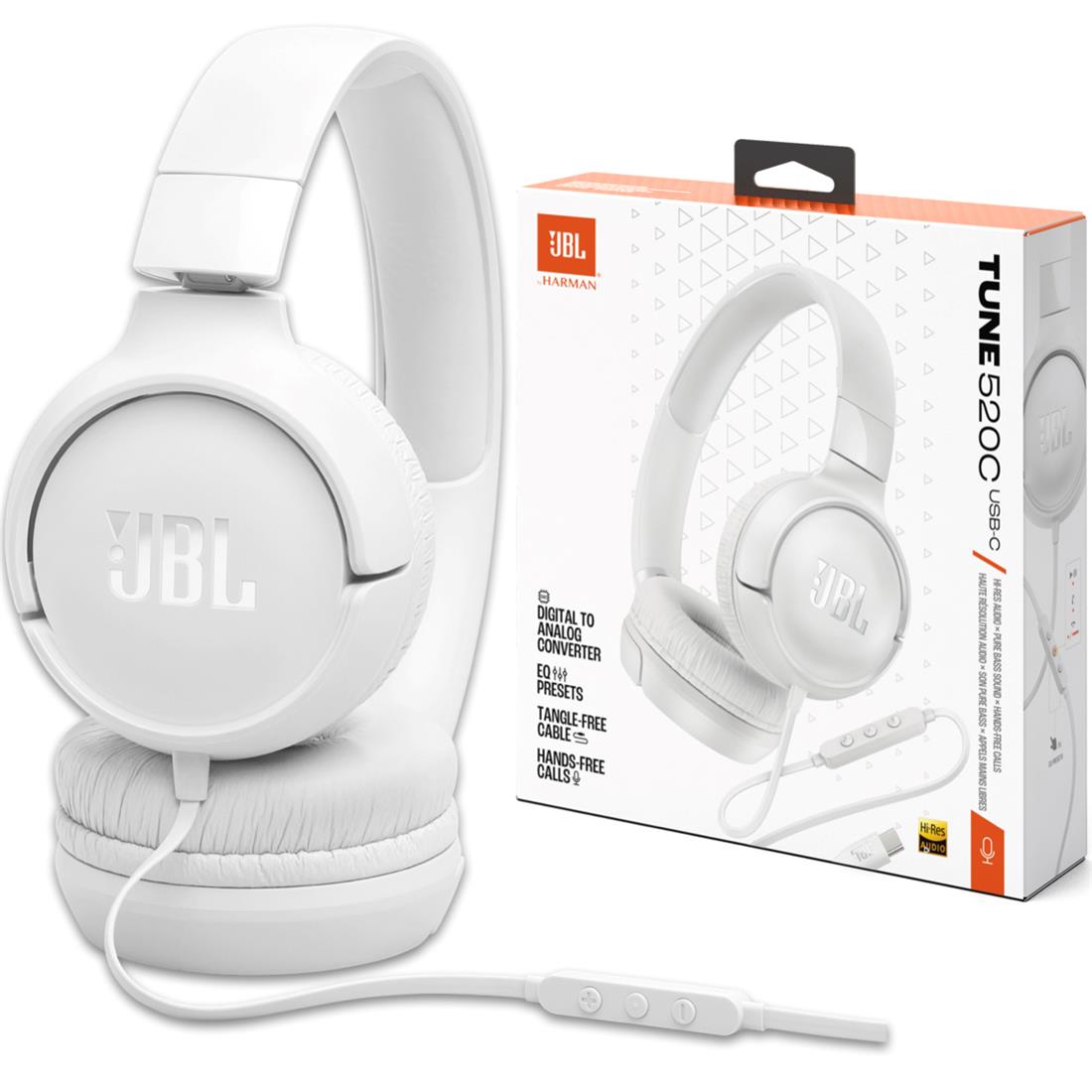 - Los auriculares con cable JBL Tune 520C USB-C son la combinación perfecta de comodidad y calidad de sonido. Con un peso ligero y un diseño ergonómico, son ideales para usar durante todo el día. Su potente sonido JBL Pure Bass y la compatibilidad con audio de alta resolución aseguran que tu música suene siempre en su mejor forma. Conéctalos a cualquier dispositivo USB-C y disfruta de un control total sobre tu experiencia musical, ya sea en la oficina, en casa o mientras te desplazas.