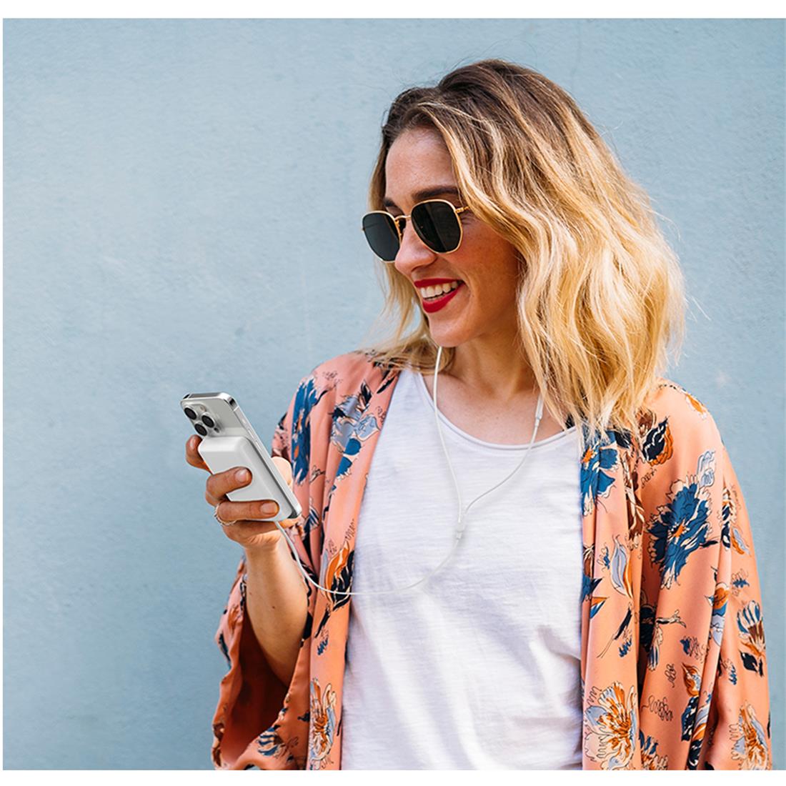 - Nuestra batería externa inalámbrica magnética 5K con soporte es portátil y suministra una carga inalámbrica y segura de 7,5 W para tu dispositivo. Olvídate de tener que usar cables o buscar un enchufe libre. Su soporte retráctil te ofrece una manera cómoda de colocar tu dispositivo fijo en posición mientras lo cargas y, simultáneamente, ves contenido por streaming o hablas por videollamada.