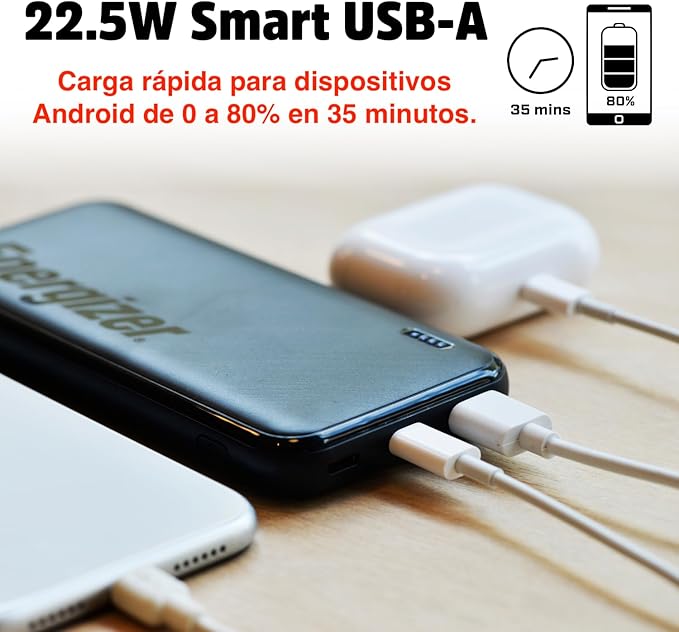 - La recarga rápida USB-C Power Delivery te permite cargar eficientemente tu banco de energía.