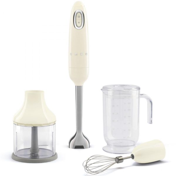 - El eje y las cuchillas de acero inoxidable se unen mediante un sistema exclusivo, lo que garantiza el máximo rendimiento. La batidora de mano Smeg viene con un completo conjunto de accesorios que amplían las posibilidades de uso: El vaso TritanTM con triturador de cuchillas de acero inoxidable y, por último, un batidor de acero inoxidable para montar varios platos. Todos los accesorios son extremadamente prácticos y fáciles de montar y desmontar.