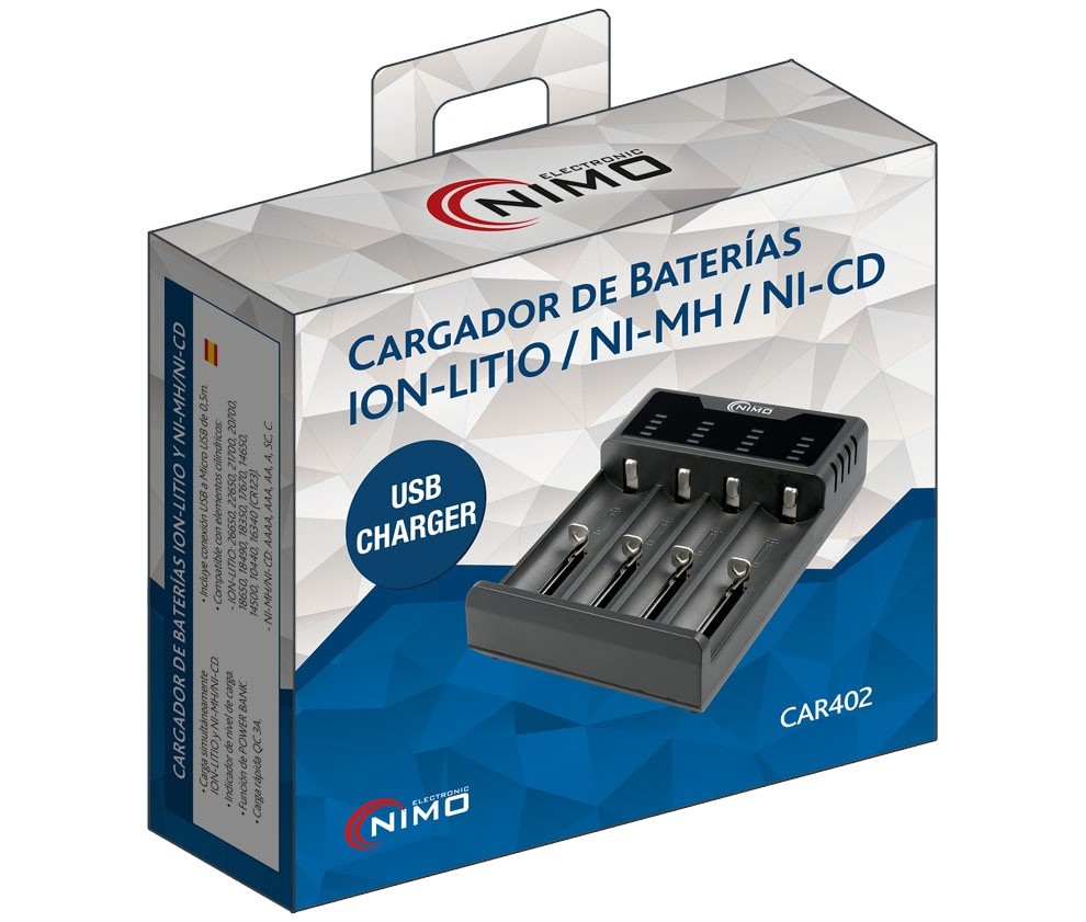 - Cargador digital de baterías para baterías de Ion-Litio, LiFePO4 y Ni-MH.
