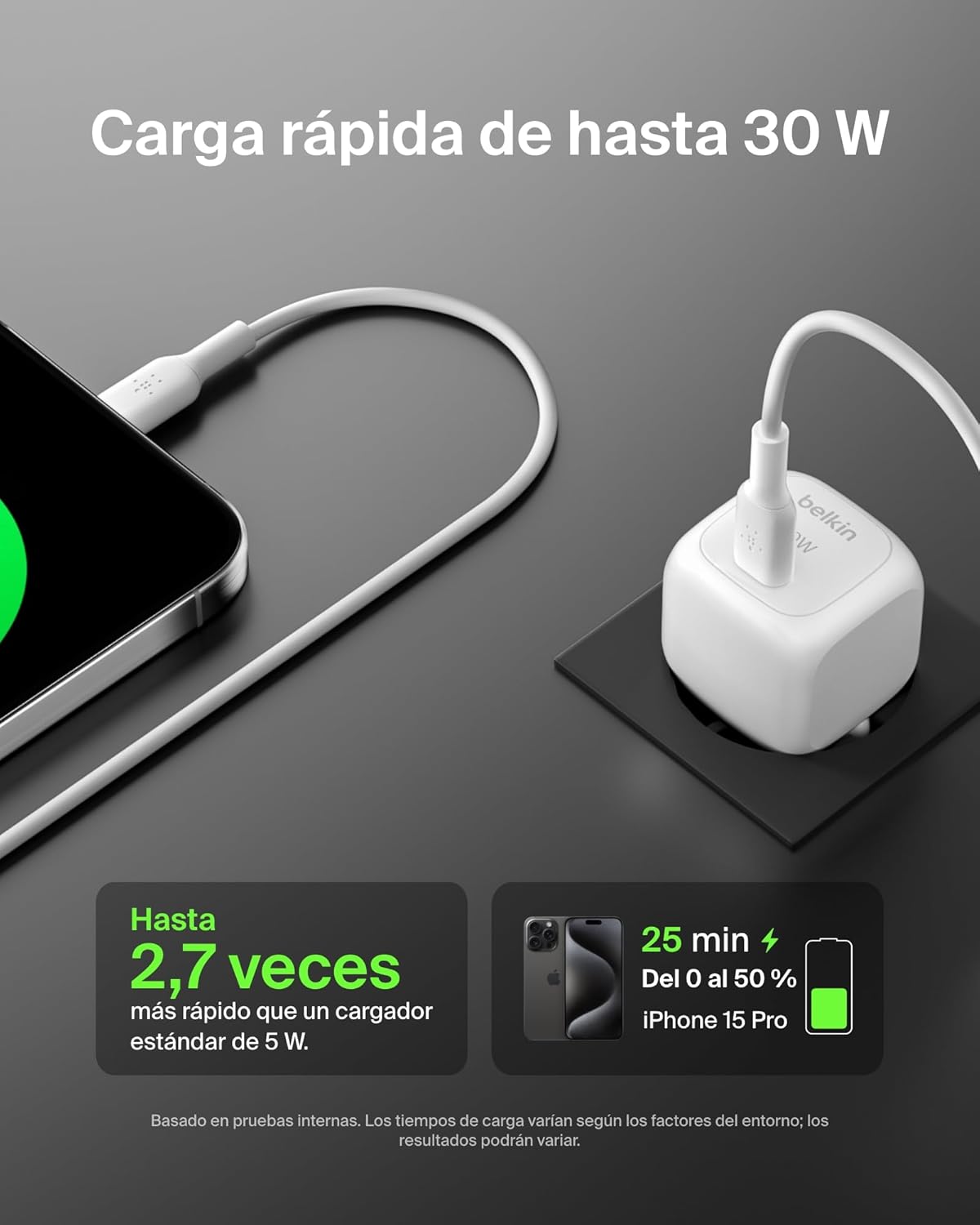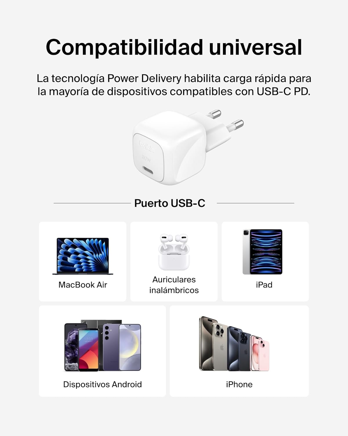 - Hasta 30 W de carga rápida mediante un solo puerto USB-C.