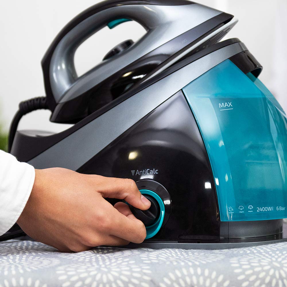 - Potente centro de planchado compacto con 2400 W, lo que te asegura un rápido calentamiento de la plancha y un planchado sencillo y eficaz.