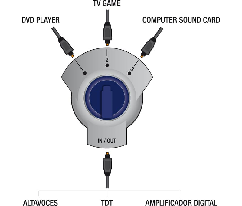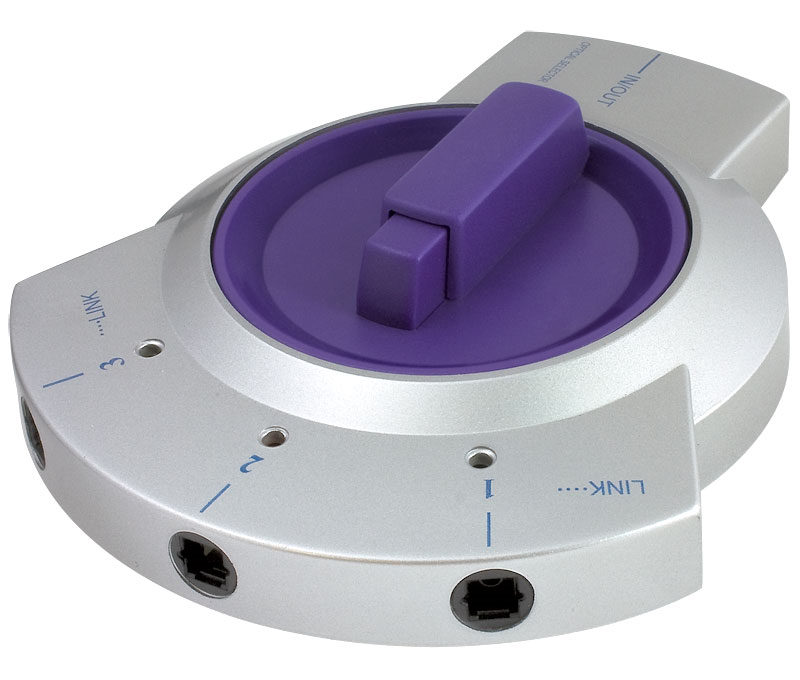 Conmutador manual de señales de fibra óptica que permite alternar hasta tres orígenes o destinos de señal.