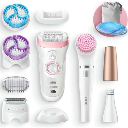 - La Braun Silk-épil 9 es la solución ideal para la depilación en casa, diseñada con un elegante color blanco y rosa. Esta depiladora cuenta con un total de 40 pinzas que garantizan una eliminación eficaz del vello, dejando tu piel suave y libre de irritaciones. Este dispositivo no solo es funcional, sino que también incorpora cabezales intercambiables para afeitar y exfoliar, adaptándose a tus necesidades personales.