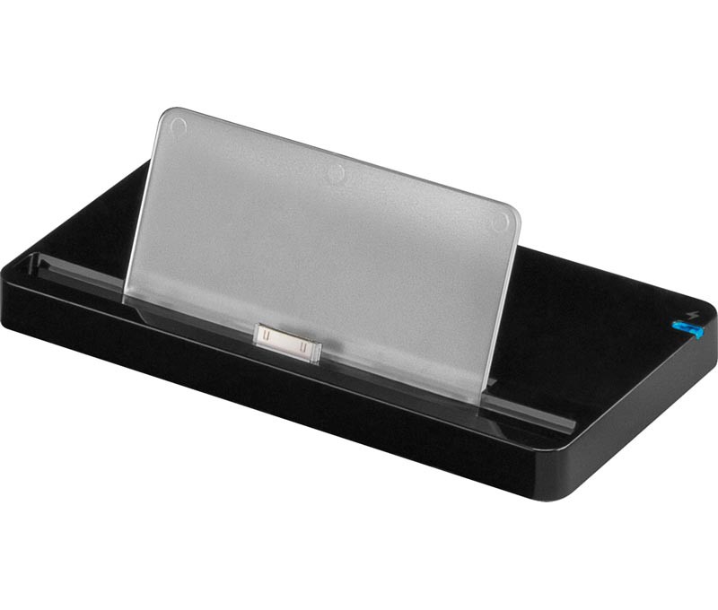 Sincroniza o carga tu iPad 2 colocándolo sobre esta base Dock. El puerto de salida de audio te permite conectar el dispositivo a unos altavoces autoamplificados a través de un cable de audio (se vende por separado).