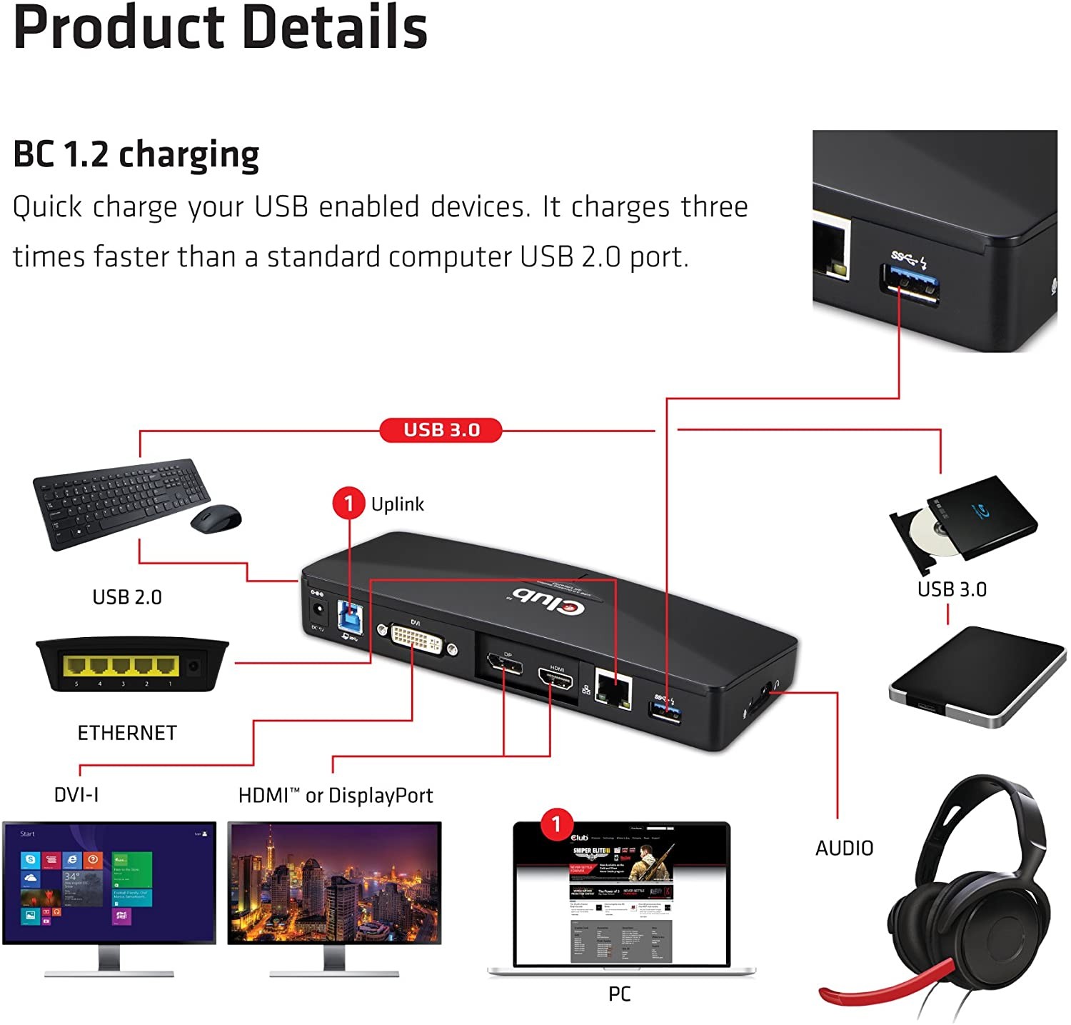 - CSV-3103D El Docking Station universal de Club 3D esta diseñado para la demanda de conectividad adicional. Con puertos USB 3.1 Gen 1 UHD integrados este docking station le permite disfrutar de una transmisión super speed de hasta 5Gbps de tus periféricos USB, lo cual le reduce el uso de cables múltiples y le permite la conexión a su portátil o tableta a través de un único cable USB 3.1 Gen 1.