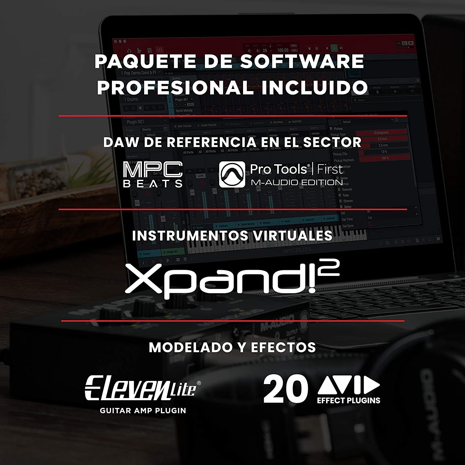 • Incluye paquete de Software como descarga online (Pro Tools First M-Audio Edition, MPC Beats, Air Music Tech Xpand!2, Eleven Lite Guitar Amps/FX Modeling, 20 Avid Effect Plugins) y cable USB