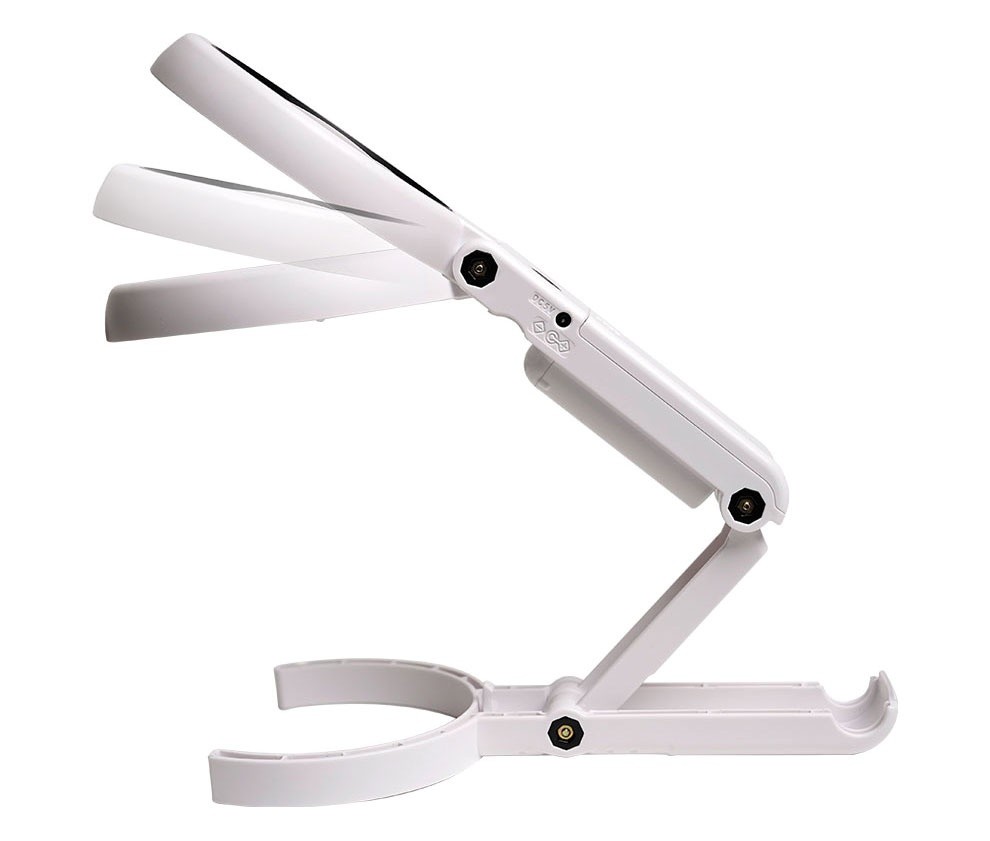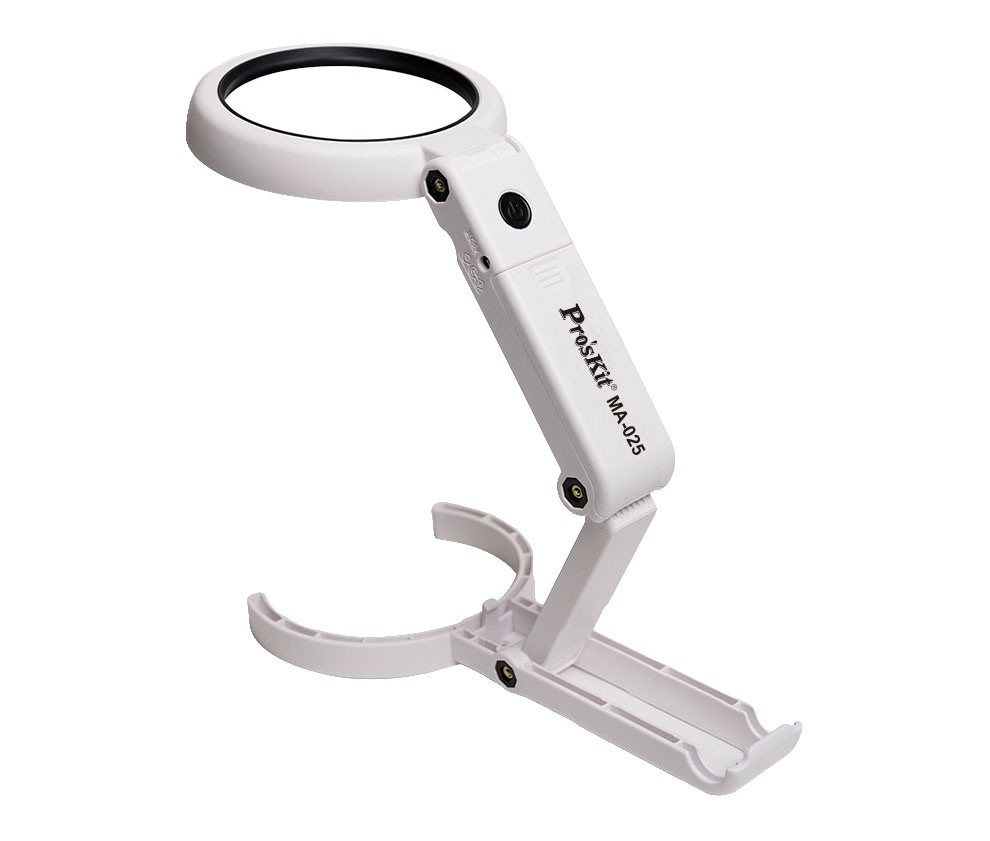 - Puede utilizarse como lupa de sobremesa desplegando el soporte articulado que se encuentra alojado en el mango