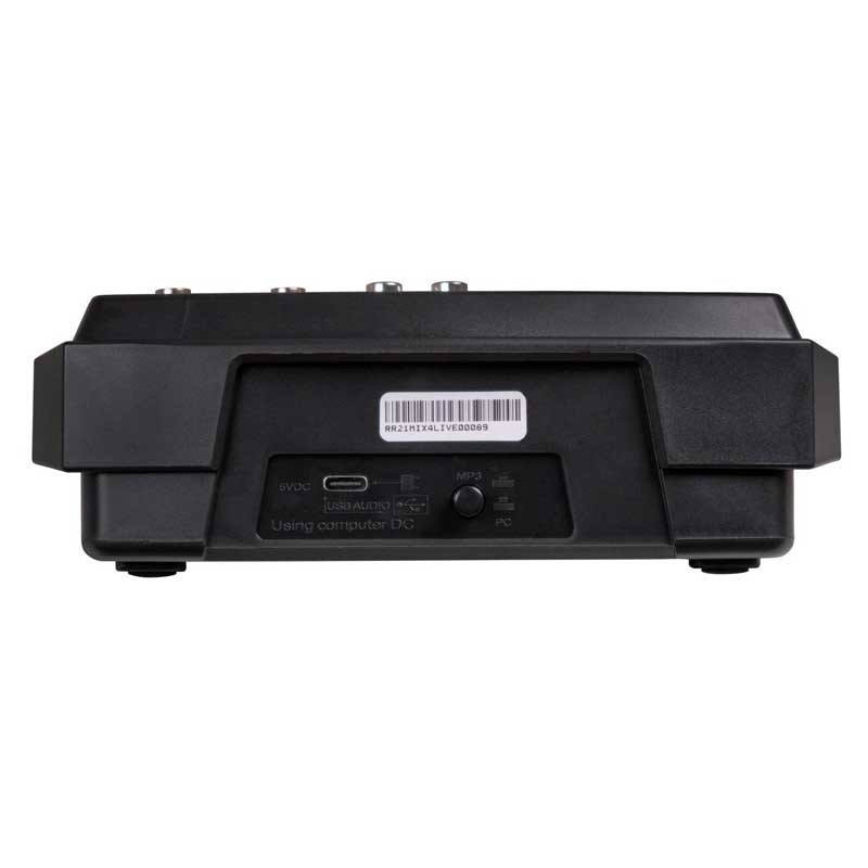 - Entradas: 2 micros/líneas balanceados, combo (XLR, 600 Ω 5 mV RMS y jack 6’3 mm, 47.000 Ω 30 mV RMS) , 1 canal estéreo línea balanceada/desbalanceada, 2 x jack 6’3 mm/2 x RCA, 47.000 Ω 300 mV RMS , 1 auxiliar estéreo para live streaming, jack 3,5 mm TRRS, 47.000 Ω 300 mV RMS , 1 micro, jack 3’5 mm mono, 600 Ω 5 mV RMS y 1 USB/PC, estéreo