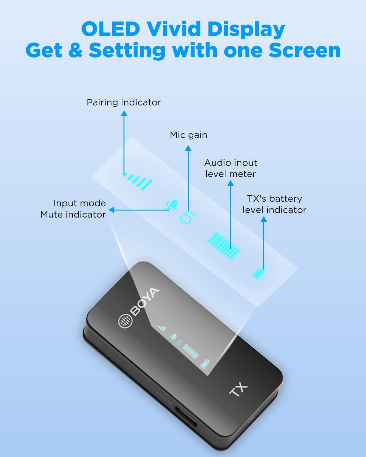 - El micrófono inalámbrico de solapa adopta una pantalla OLED HD, y la información del micrófono es clara de un vistazo. El micrófono inalámbrico para iPhone proporciona intensidad de señal, nivel de volumen en tiempo real, potencia restante, nivel de ganancia y efecto de carga. Puede configurar manualmente el tiempo de retroiluminación, el volumen de salida, el nivel de ganancia del micrófono, el modo de entrada de audio, etc. Configure libremente los parámetros requeridos para que la grabación sea más profesional.