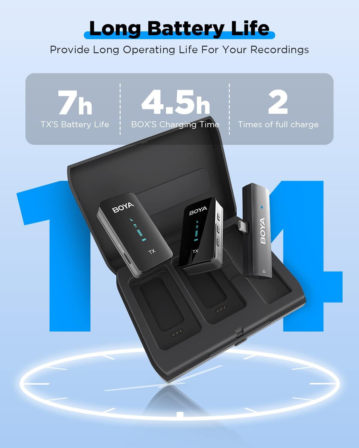 - El micrófono para iPhone adopta la última tecnología de almacenamiento de energía y esquema de transmisión de señal para optimizar el consumo de energía. El tiempo de trabajo continuo TX puede exceder las 7 horas.