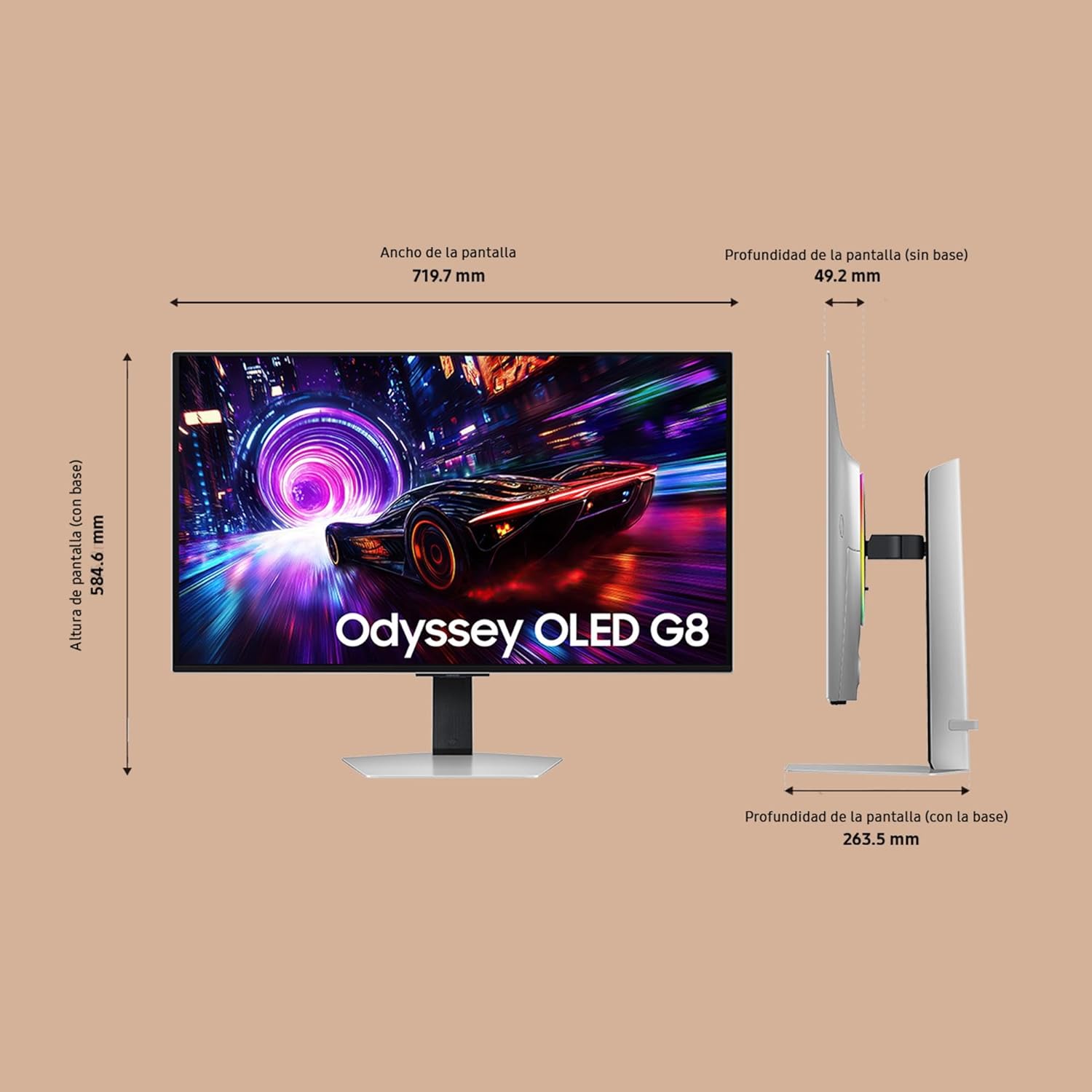 - Dimensiones con peana (AnxAlxPr) 719.7 x 584.6 x 263.5 mm