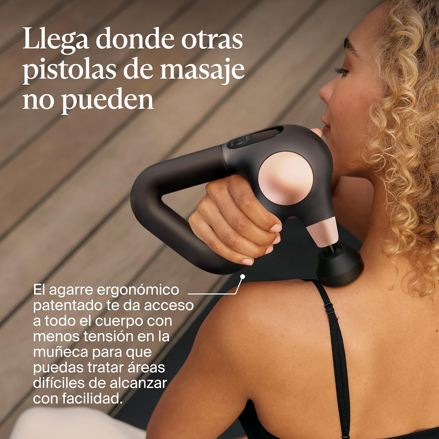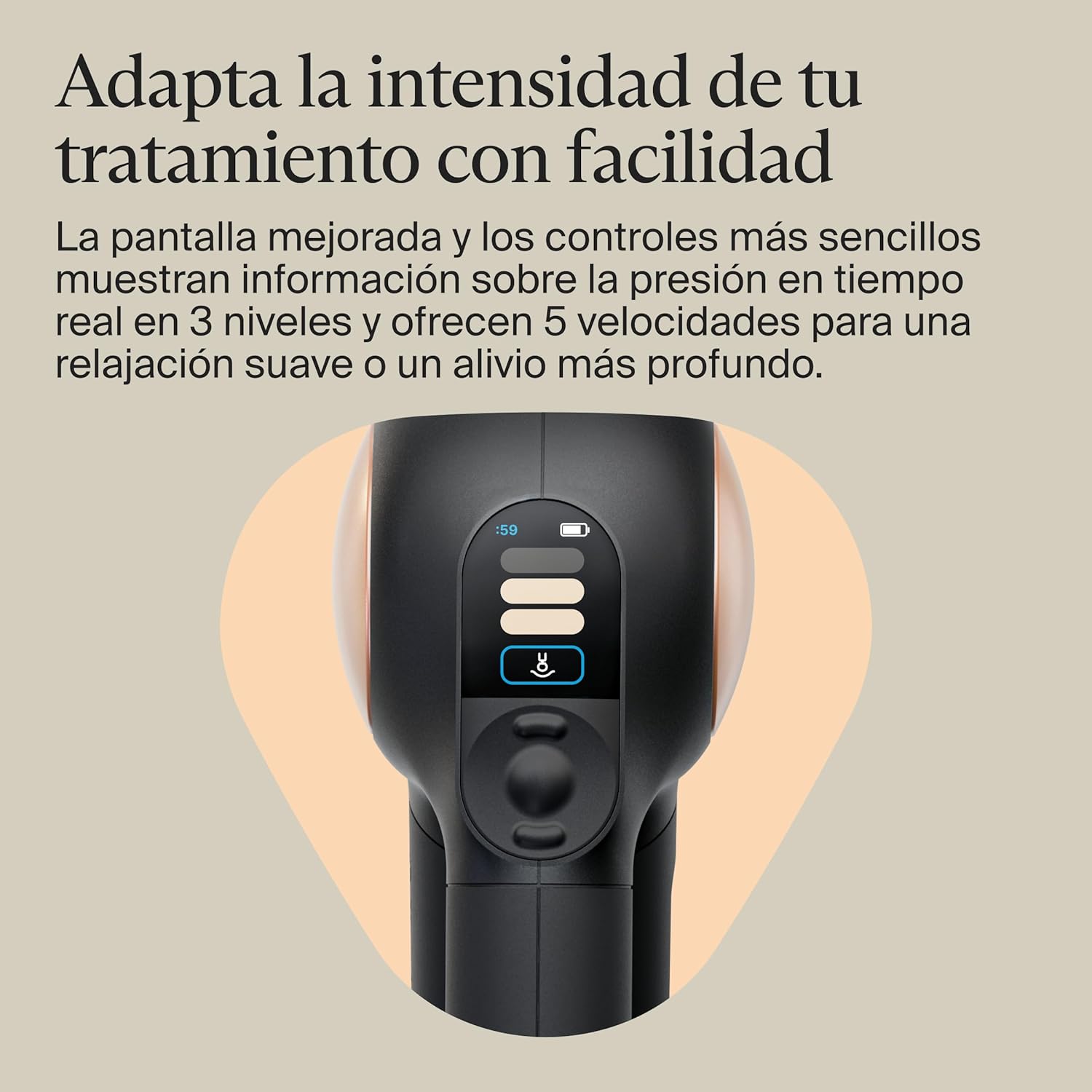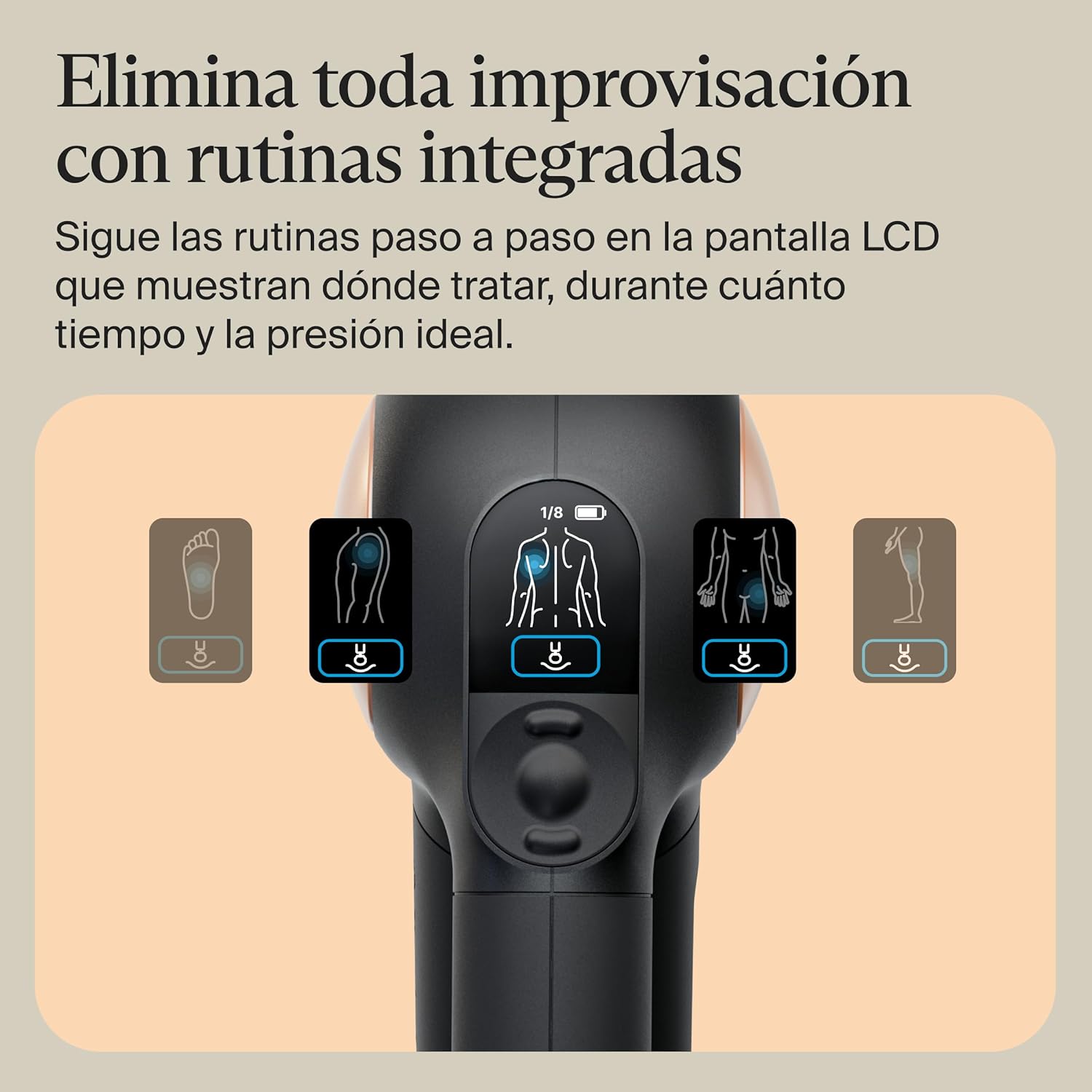- Rutinas guiadas integradas: incluye 4 rutinas diseñadas por expertos precargadas en el dispositivo, guiándote sobre dónde masajear, durante cuánto tiempo y con cuánta presión, todo desde la pantalla LCD. Puedes actualizarlos con hasta 5 de tus rutinas favoritas desde la aplicación Therabody para tratamientos personalizados.