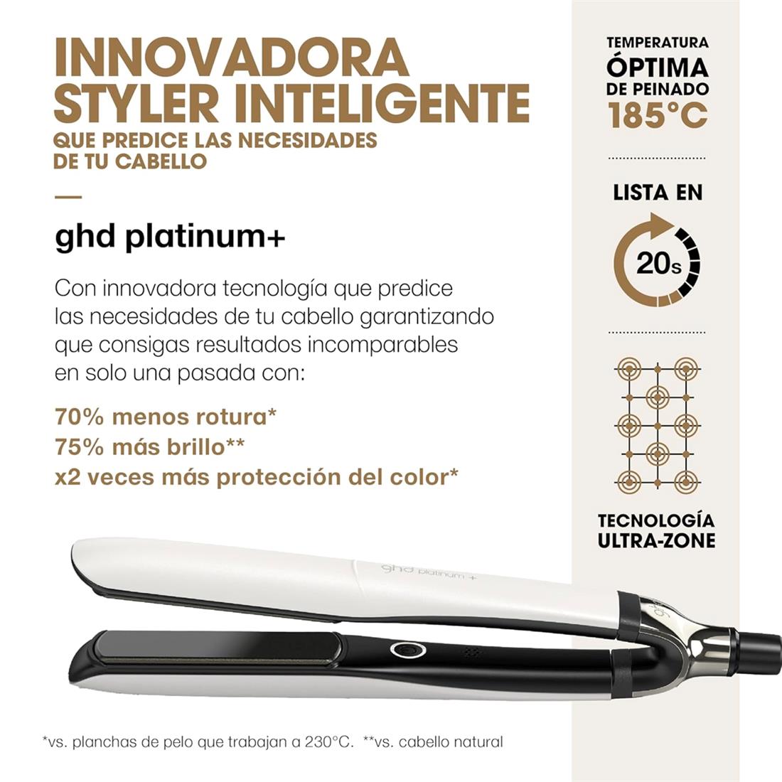 - Trabaja a una temperatura óptima de 185ºC, protegiendo el cabello y logrando un 70% más de fuerza y un 20% más de brillo.