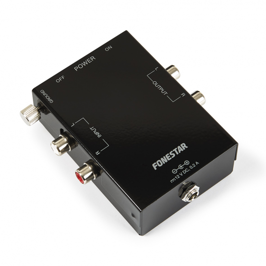 Preamplificador estéreo para giradiscos con cápsula magnética. Adaptador de corriente incluido. Terminal de conexión a tierra.