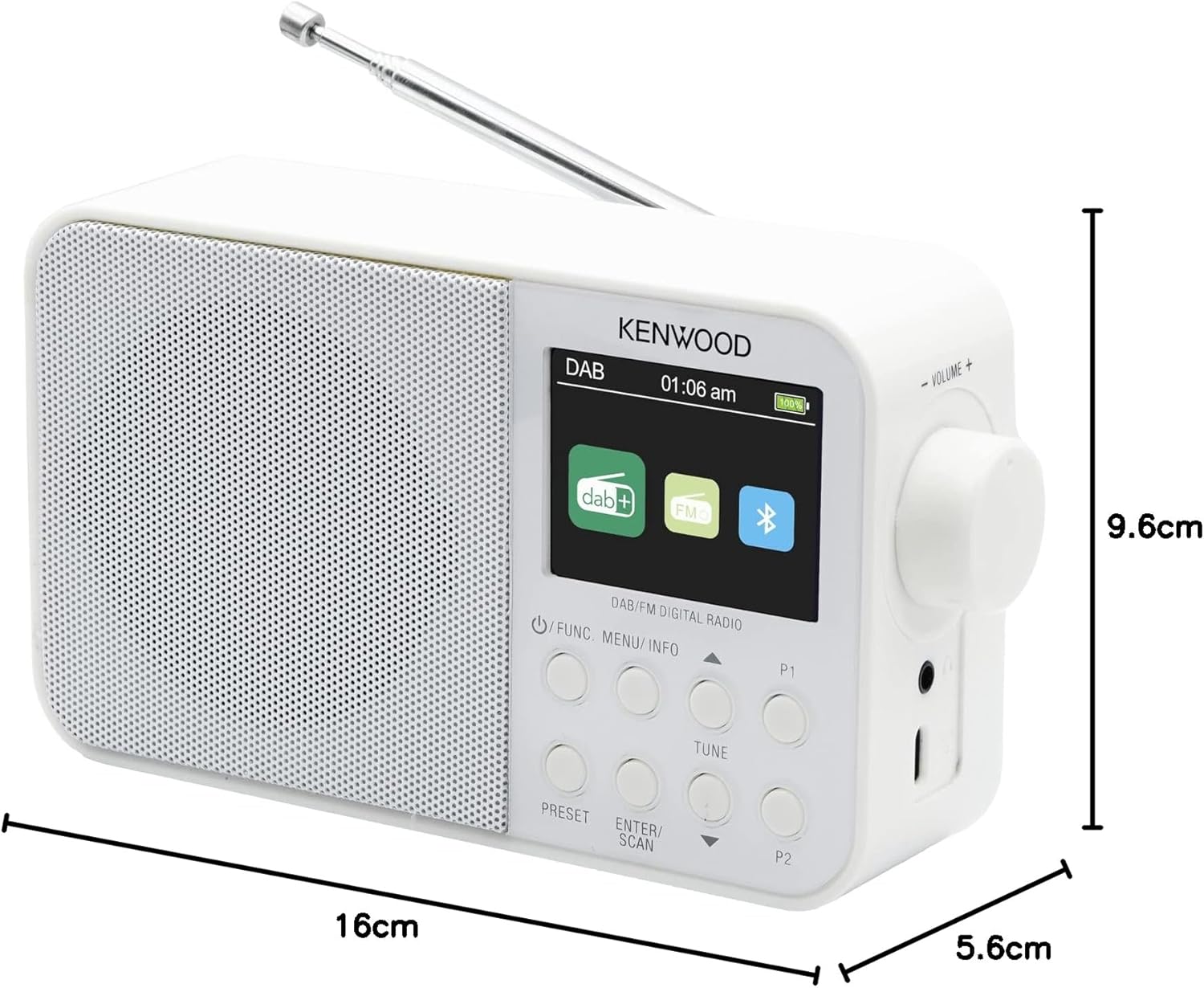 - Dimensiones (ancho x alto x profundidad): 160 x 96 x 56 mm. Peso: 325 g. Contenido del envío: fuente de alimentación DAB+ Radio / USB-C