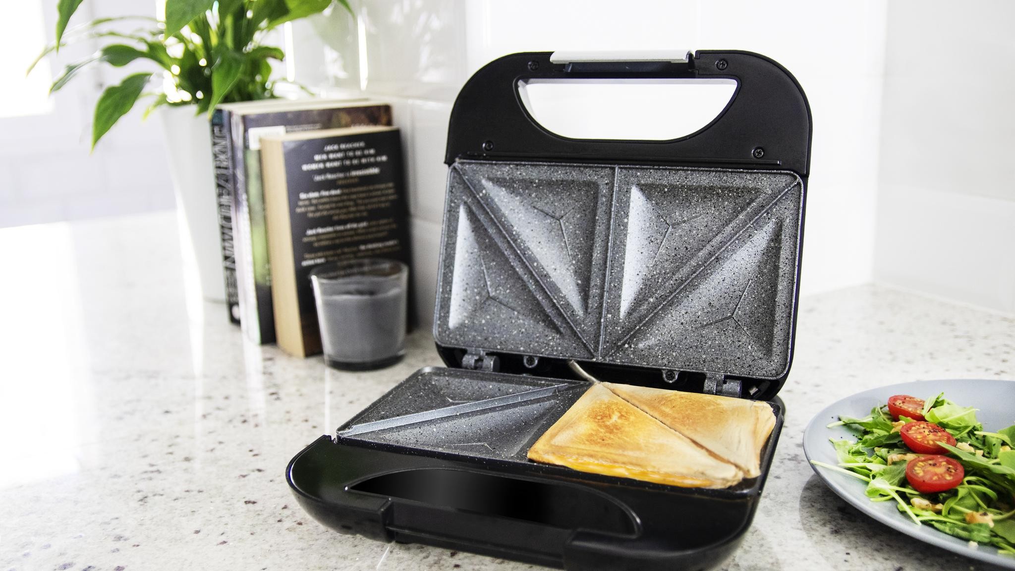 - La superficie de triangulo que corta el sándwich lo comprime para un tostado perfecto y una cocción ideal en el interior.