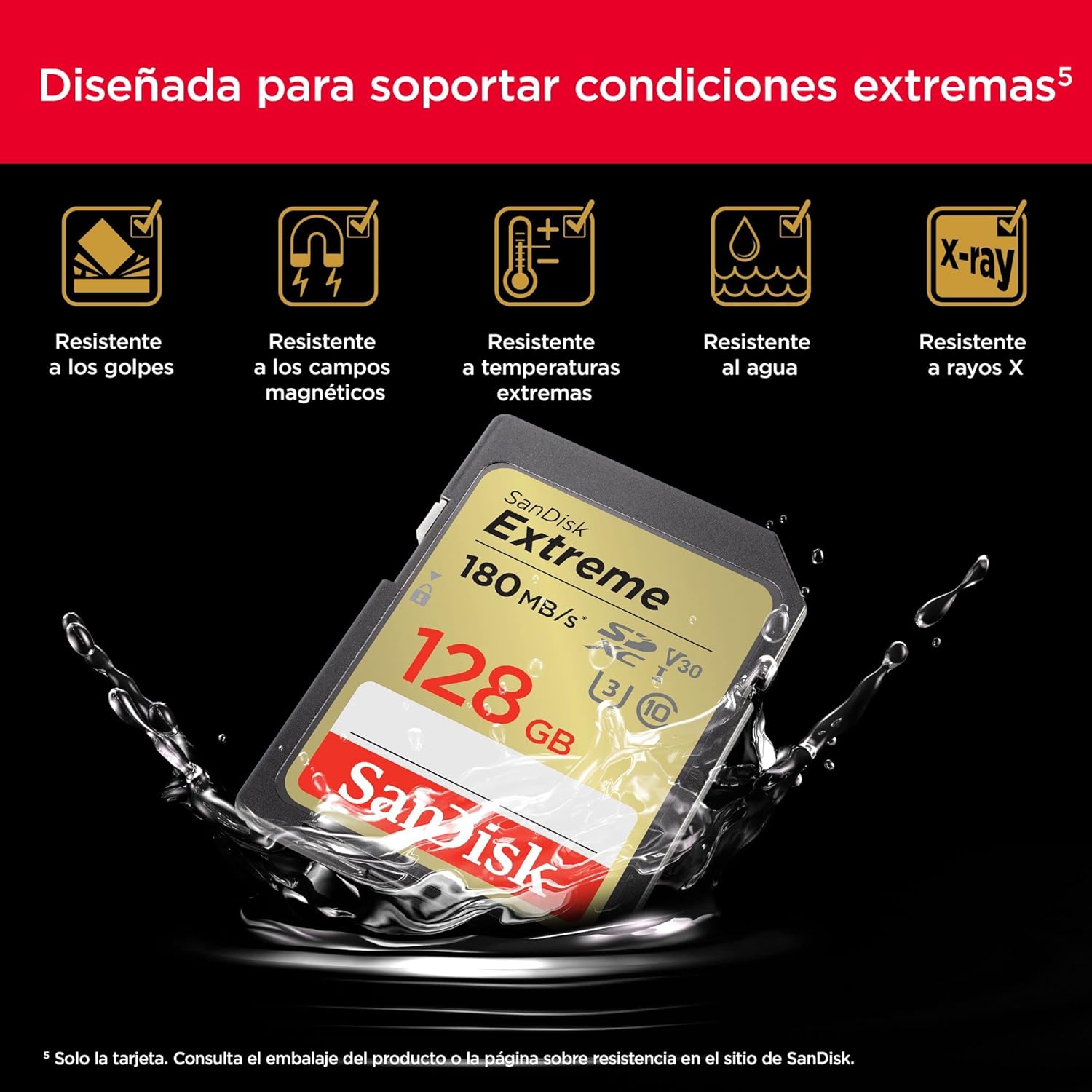 - Contenido del envío: tarjeta de memoria SanDisk Extreme SDXC UHS-I de 128 GB (V30, transmisión de 180 MB/s, U3, 4K UHD, tecnología SanDisk QuickFlow, impermeable, resistente a los golpes, resistente a la temperatura)