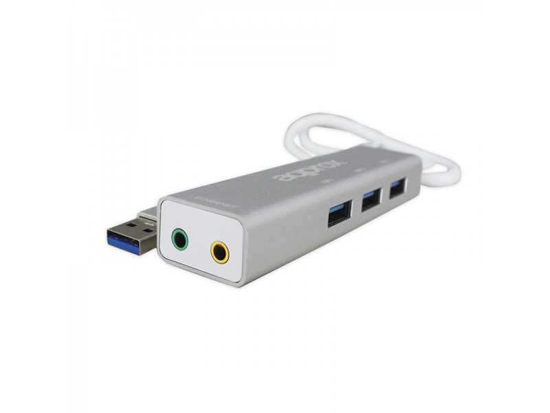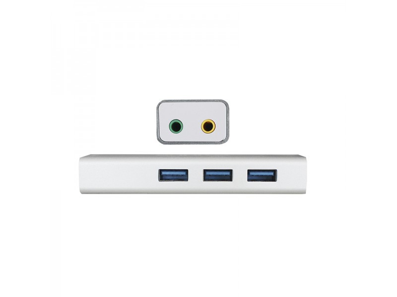 - Este USB hub consta de 3 puertos USB 3.0 hasta 5Gbps, un adaptador de sonido usb 5.1, conectores Jack 3.5mm Audio (salida) y Micrófono (entrada).