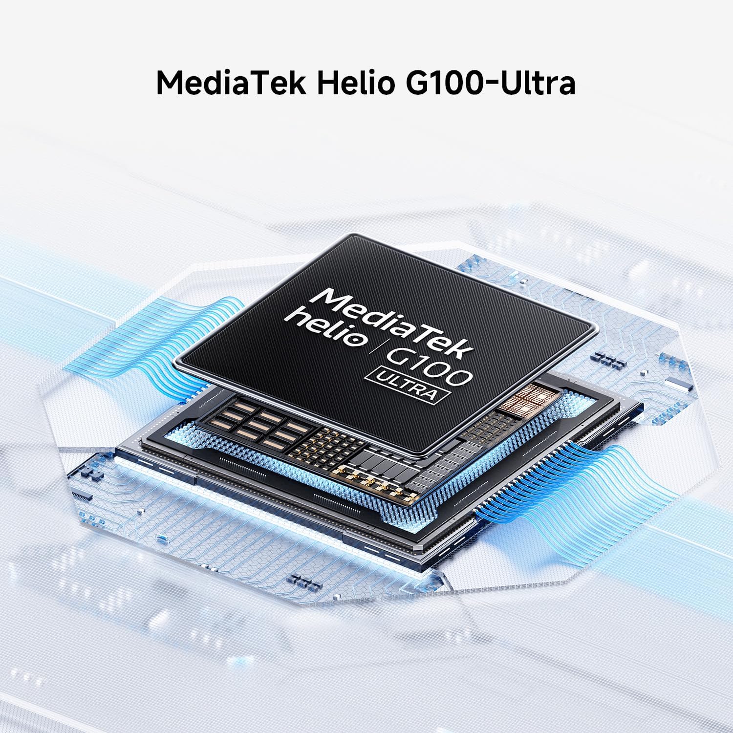 - Procesador MediaTek Helio G100-Ultra con RAM LPDDR4X y almacenamiento UFS 2.2